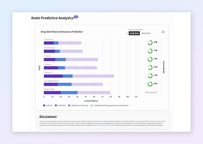 Predict potential deal sizes at each stage of drug development using our first-in-class AI-based deal value predictive analytics, and uncover how likely it would be for a drug to progress to the next phase of development if you were to partner.