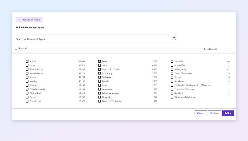 Cast a wide net with each search to easily locate conference papers, awarded grants, preprints, dissertations, books, data sets, and patents alongside content from the world’s leading journals.