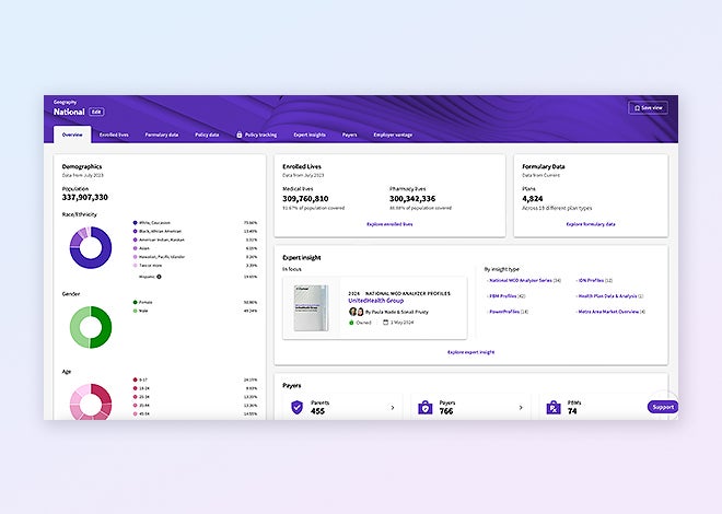 처방약 목록, 의료 급여 보장 정책, 건강 보험 가입, 현재 트렌드를 포함한 종합적인 의료 데이터를 모두 한곳에서 이용해 시간과 자원을 절약하세요.
