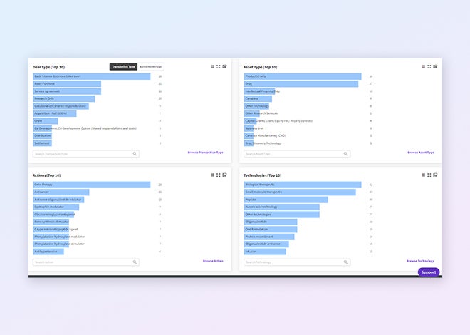 治療分野または適応症別に集計されたトップ製薬企業および複数年のディール傾向を調べることで、時間を大幅に短縮できます。