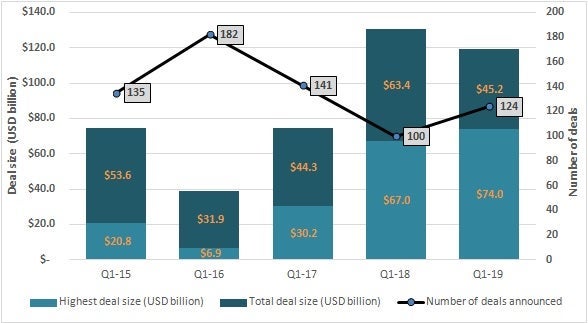 Figure 1: M&A deal activity in Q1, 2015-2019: New M&A volume increased by 24% but total deal value declined by 9%. Source: Cortellis Deals Intelligence